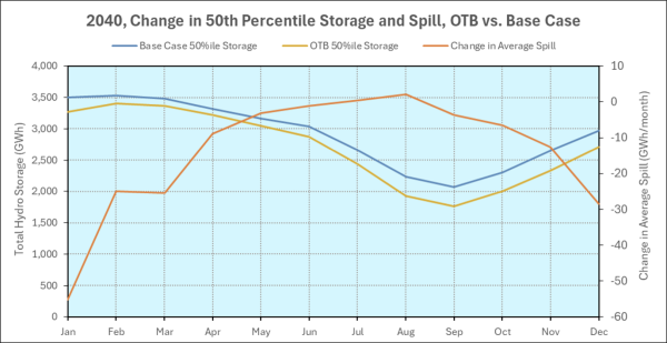 The chart also shows the change in average spill (orange curve) between the two scenarios, which is most prominent in the summer months, where spill is significantly less in the OTB scenario compared to the Base Case.